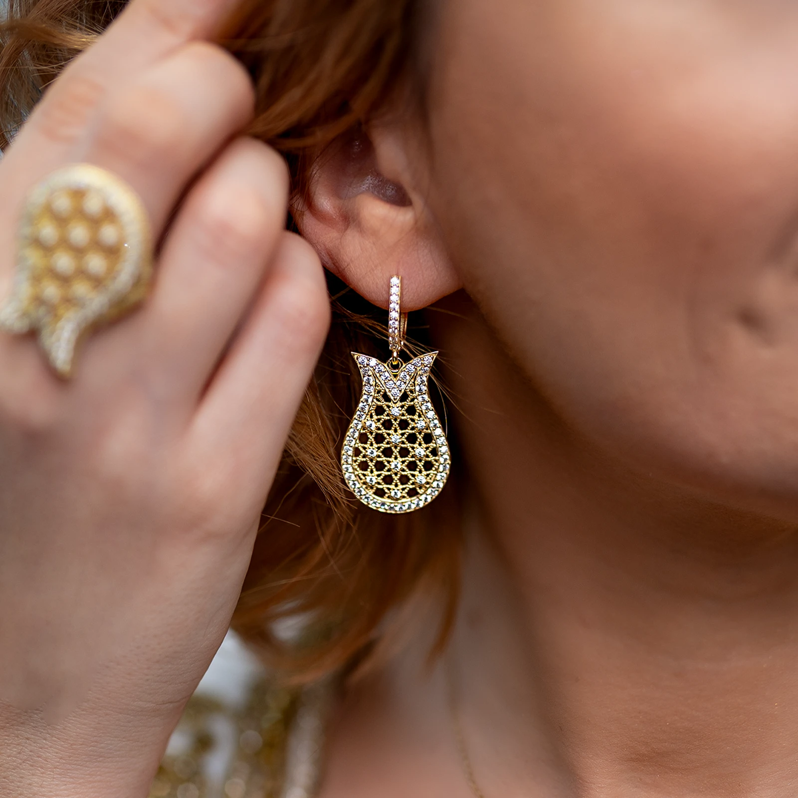 Pozłacany komplet biżuterii ze srebra 925 w kształcie tulipana, ażurowy, regulowany - Złoto Haremu