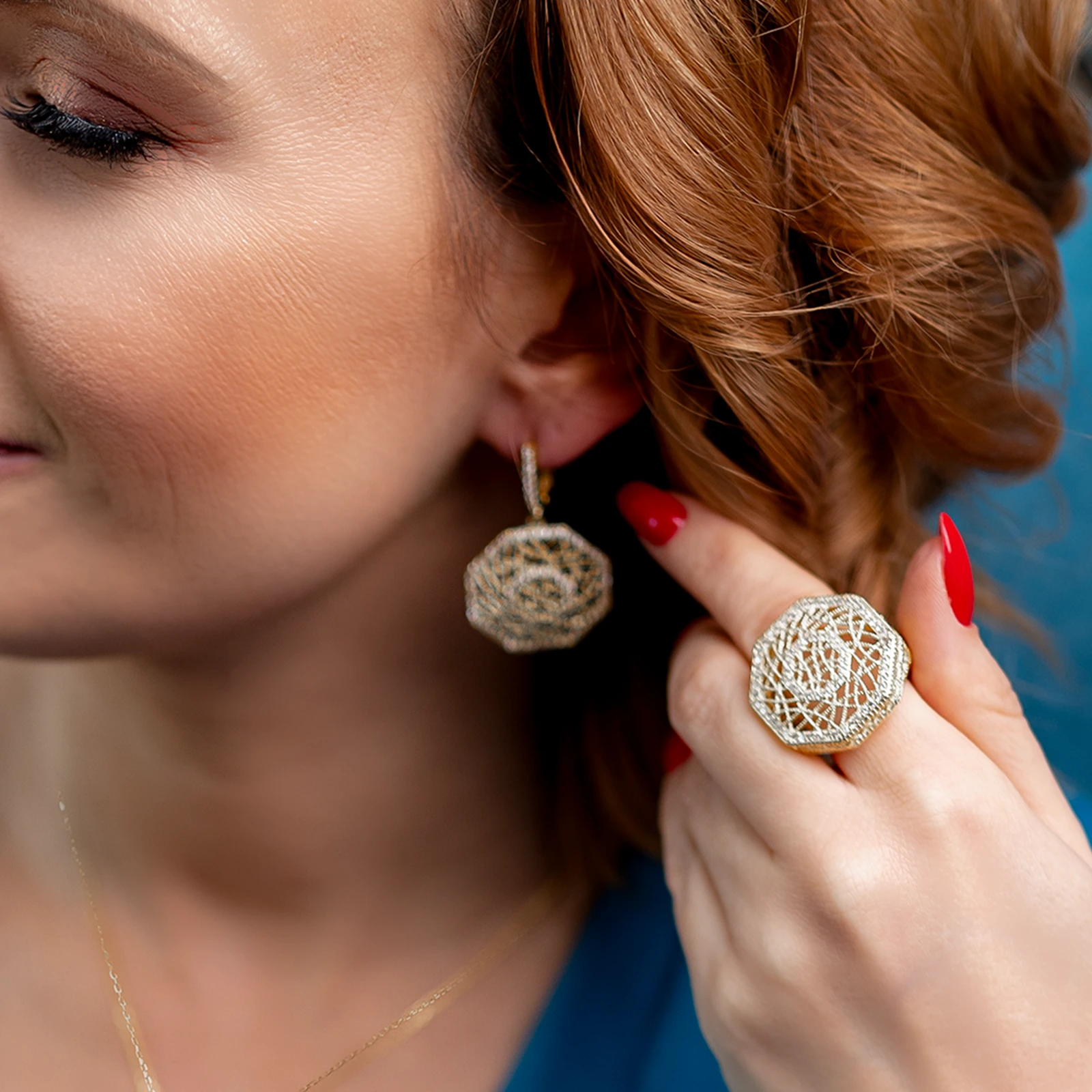 Pozłacany ośmiokątny komplet biżuterii ze srebra 925, ażurowy, regulowany - Złoto Haremu