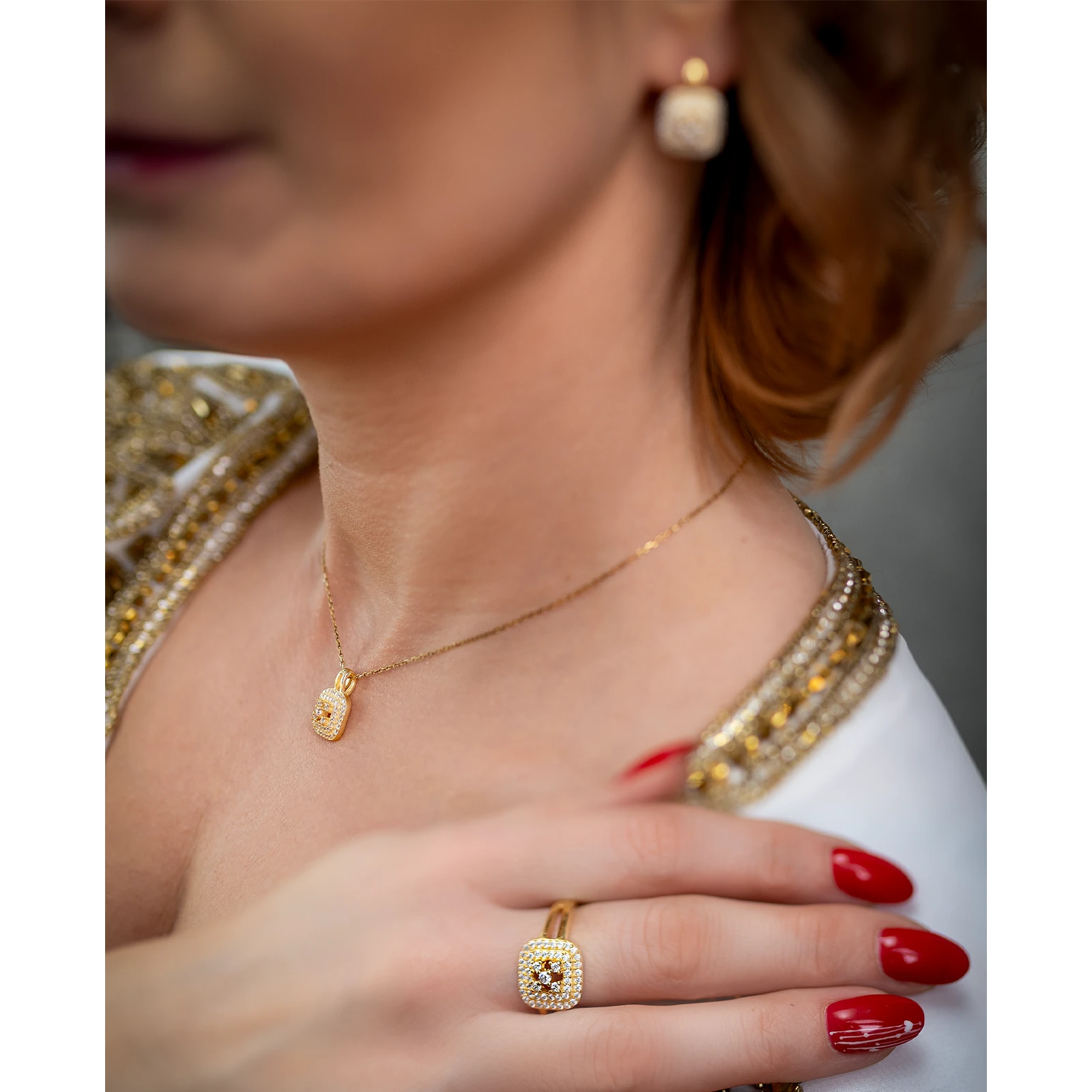 Komplet biżuterii łączy klasyczną elegancję z nowoczesnym stylem. Składa się z naszyjnika, kolczyków i pierścionka, wykonanych z pozłacanego srebra próby 925. Każdy element zdobią dwa rzędy lśniących cyrkonii, tworząc efektowny, koncentryczny wzór. Naszyjnik wyróżnia się kwadratową zawieszką z ażurową rozetą, która dodaje mu lekkości. Kolczyki na wygodnym biglu powtarzają ten motyw, a pierścionek z kwadratowym oczkiem doskonale dopełnia zestaw. Biżuteria subtelnie podkreśli każdą stylizację, dodając jej nutę luksusu i wyrafinowania.