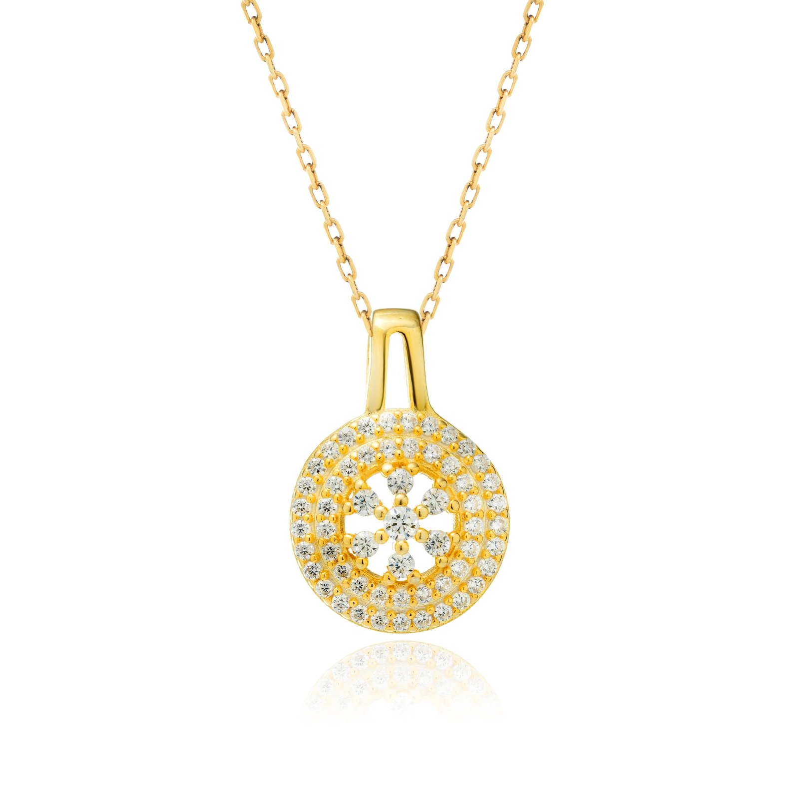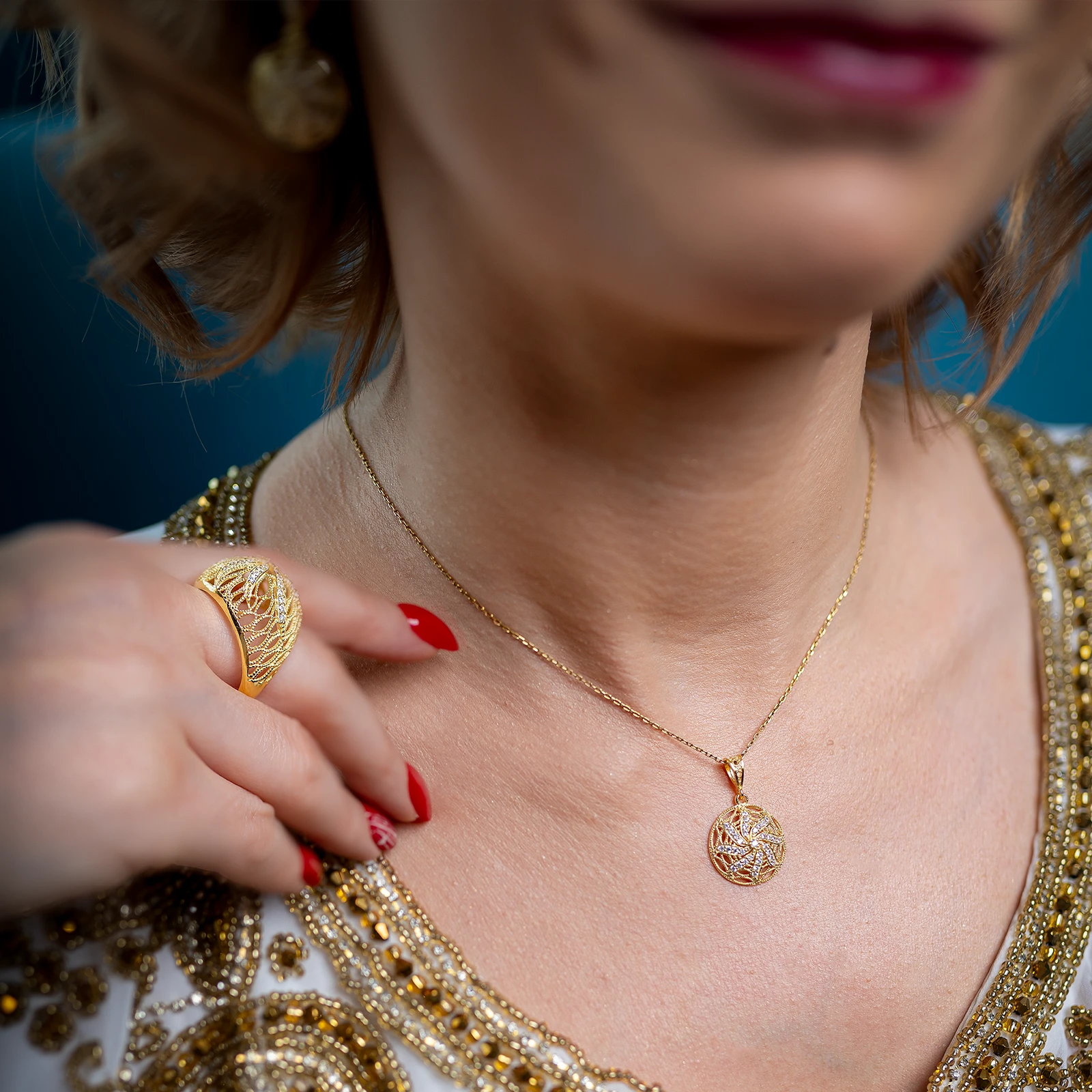 Komplet biżuterii łączy klasyczną elegancję z nowoczesnym designem, tworząc wyjątkową ozdobę na każdą okazję. Składa się z naszyjnika, kolczyków i pierścionka, wykonanych z pozłacanego srebra próby 925. Wszystkie elementy zdobią dwa rzędy lśniących cyrkonii, układających się w efektowny, koncentryczny wzór. Naszyjnik wyróżnia się okrągłą zawieszką z ażurową rozetą, która dodaje mu lekkości i subtelności. Kolczyki powtarzają ten sam motyw, a ich wygodne zapięcie typu bigiel zapewnia komfort noszenia. Pierścionek z okrągłym oczkiem i misternie osadzonymi cyrkoniami doskonale komponuje się z całością, podkreślając harmonię zestawu. Dzięki eleganckiemu wzornictwu i starannemu wykonaniu komplet sprawdzi się zarówno na co dzień, jak i podczas wyjątkowych okazji, dodając stylizacjom blasku i wyrafinowania.