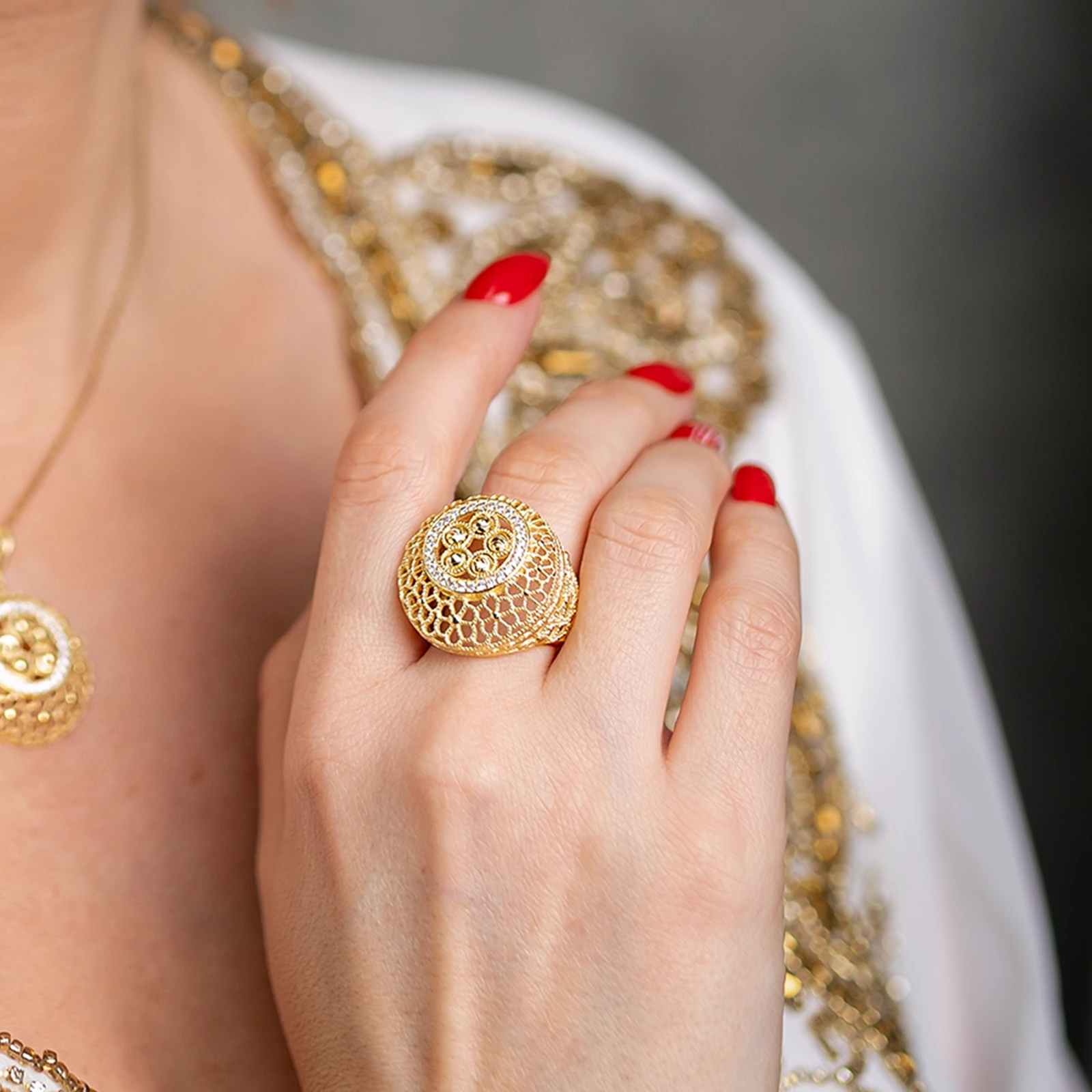 Pozłacany okrągły pierścionek ze srebra 925, ażurowy, regulowany - Złoto Haremu