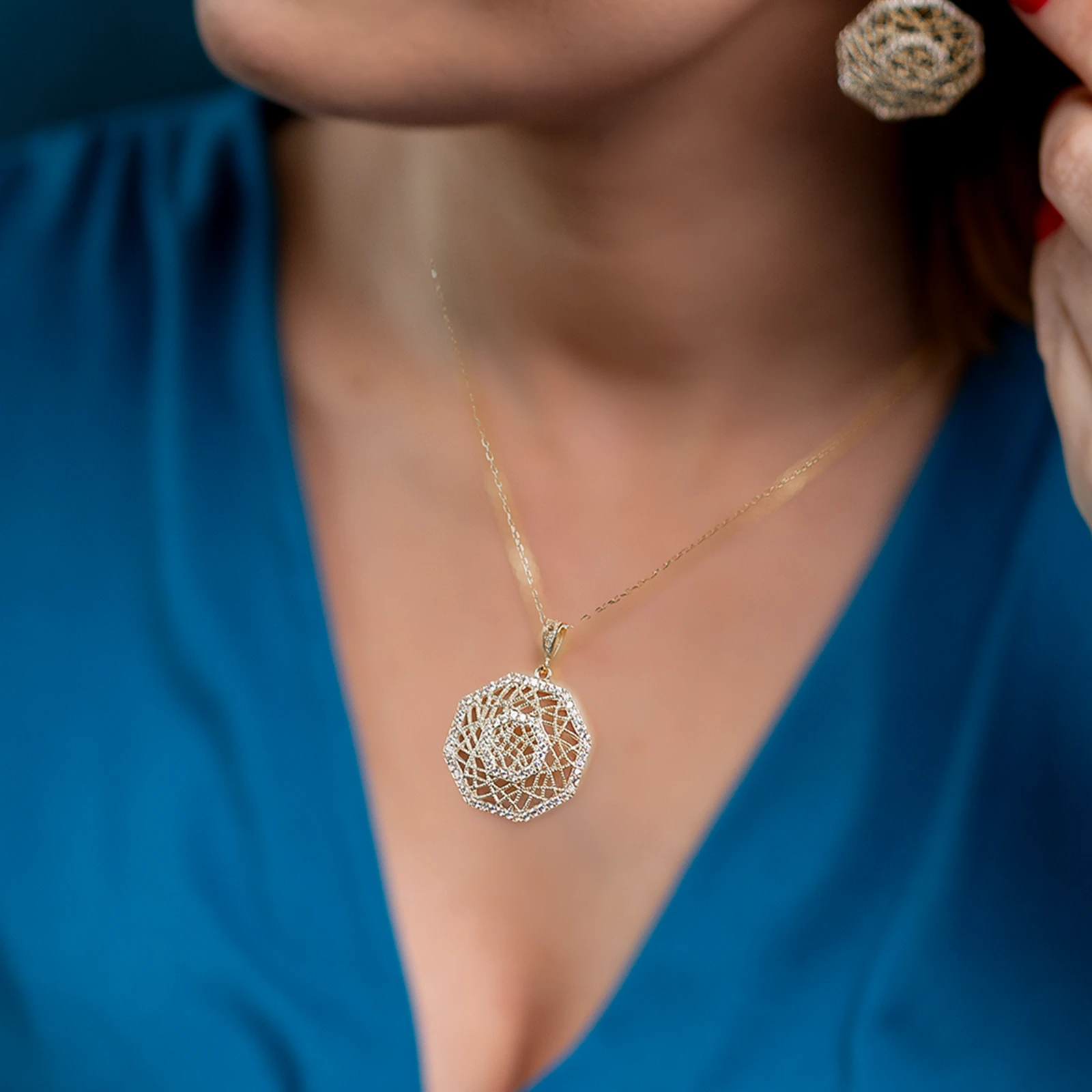 Pozłacany ośmiokątny komplet biżuterii ze srebra 925, ażurowy, regulowany - Złoto Haremu