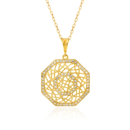 Pozłacany naszyjnik ze srebra próby 925 zachwyca ośmiokątną zawieszką o misternym, ażurowym wzorze. Starannie osadzone, błyszczące kamienie subtelnie odbijają światło, podkreślając elegancję biżuterii. Delikatny łańcuszek harmonijnie komponuje się z zawieszką, tworząc stylowy i wyrafinowany dodatek. To doskonały wybór zarówno na co dzień, jak i na wyjątkowe okazje, dodający blasku każdej stylizacji.