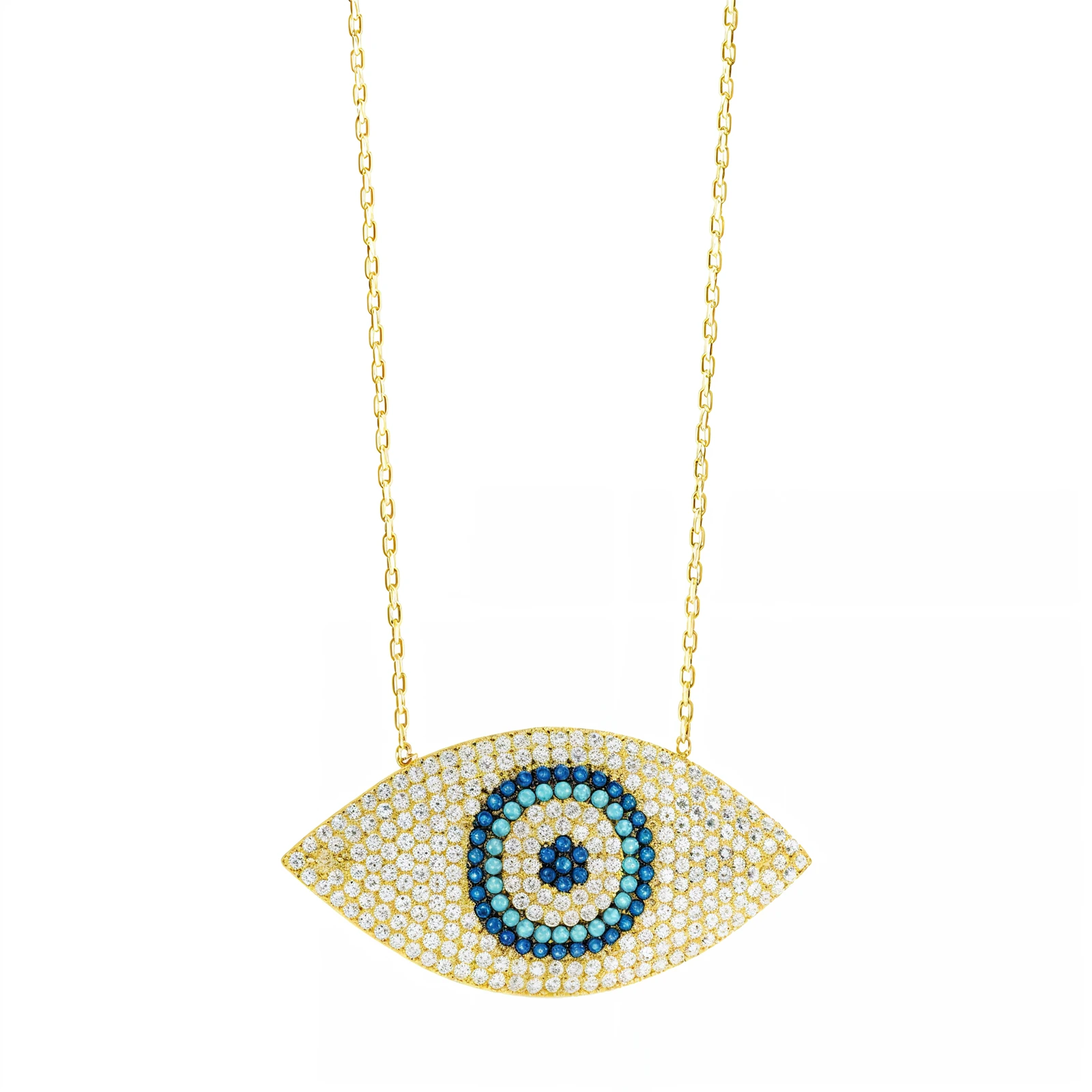 Pozłacany naszyjnik oko proroka - z pewnością jest to propozycja dla kobiet które uwielbiają delikatność, jakość oraz blask. Forma wykonania tego orientalnego naszyjnika cechuje się niezwykłą precyzją, a także lekkością i delikatnością, więc świadczy to o najwyższej jakości wykonania tej orientalnej biżuterii. Pozłacany naszyjnik oko proroka został zaprojektowany w szczególności z myślą o kobietach, które cenią wygodę, delikatność i elegancję. W związku z tym idealnie będzie się prezentował na każdej kobiecie oraz dopełni każdą kobiecą kreację. Tymczasem piękne cyrkonie w charakterystycznych kolorach dla oka proroka będą przyciągały każdego, kto znajdzie się w towarzystwie osoby noszącej srebrny naszyjnik oko proroka. Dodatek małych cyrkonii nadaje również niesamowitego blasku imponującej biżuterii. Dzięki temu naszyjnik jest naprawdę wyjątkowy i warty uwagi!
