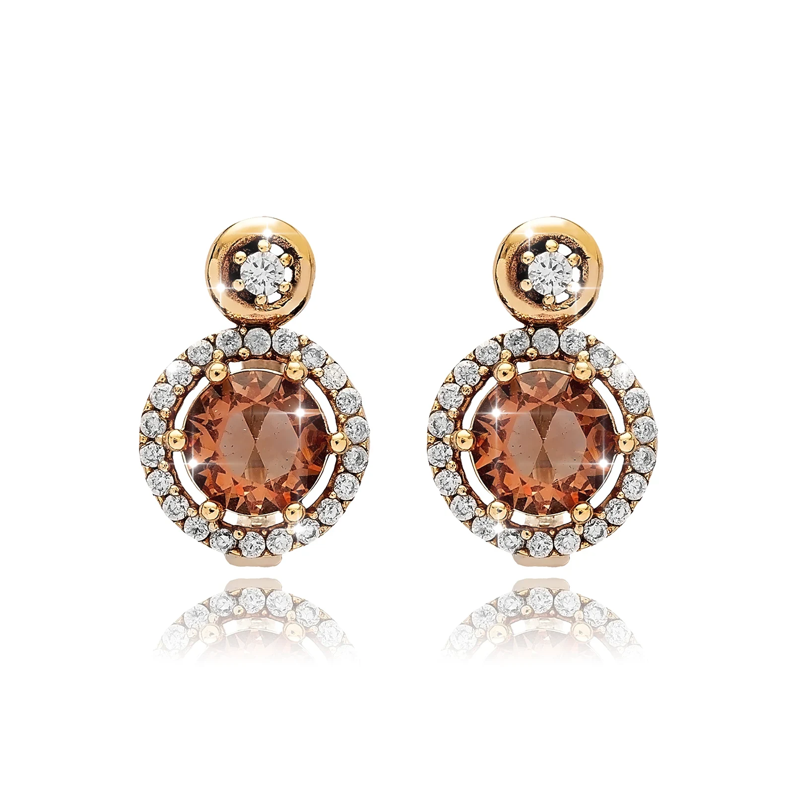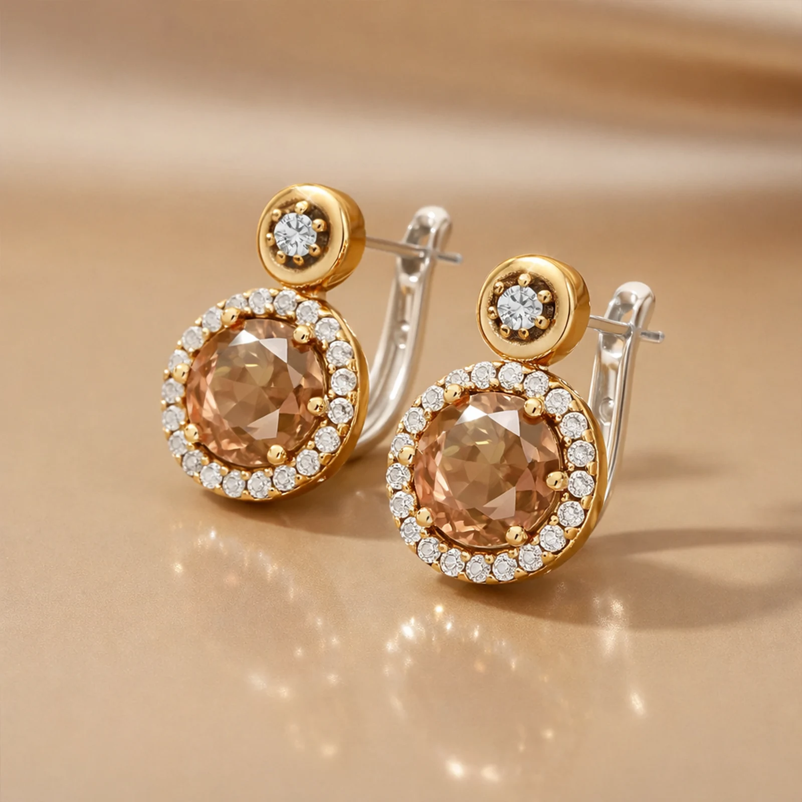 Kolczyki wykonane ze srebra 925 i brązu, z centralnie osadzonym zultanitem, którego otacza dekoracyjny rząd drobnych cyrkonii. Cyrkonie podkreślają zmienną barwę kamienia i nadają całości wyrazistości, jednocześnie porządkując kompozycję. Zultanit wyróżnia się zdolnością zmiany koloru w zależności od rodzaju i kąta padania światła. W świetle dziennym przyjmuje odcienie zieleni, często o limonkowym charakterze. W pomieszczeniach pojawiają się barwy szampańskie lub cynamonowe, natomiast na zewnątrz może przechodzić w tony brzoskwiniowe, różowe, a nawet delikatnie fioletowe. Kolory często się przenikają, tworząc dynamiczny efekt.