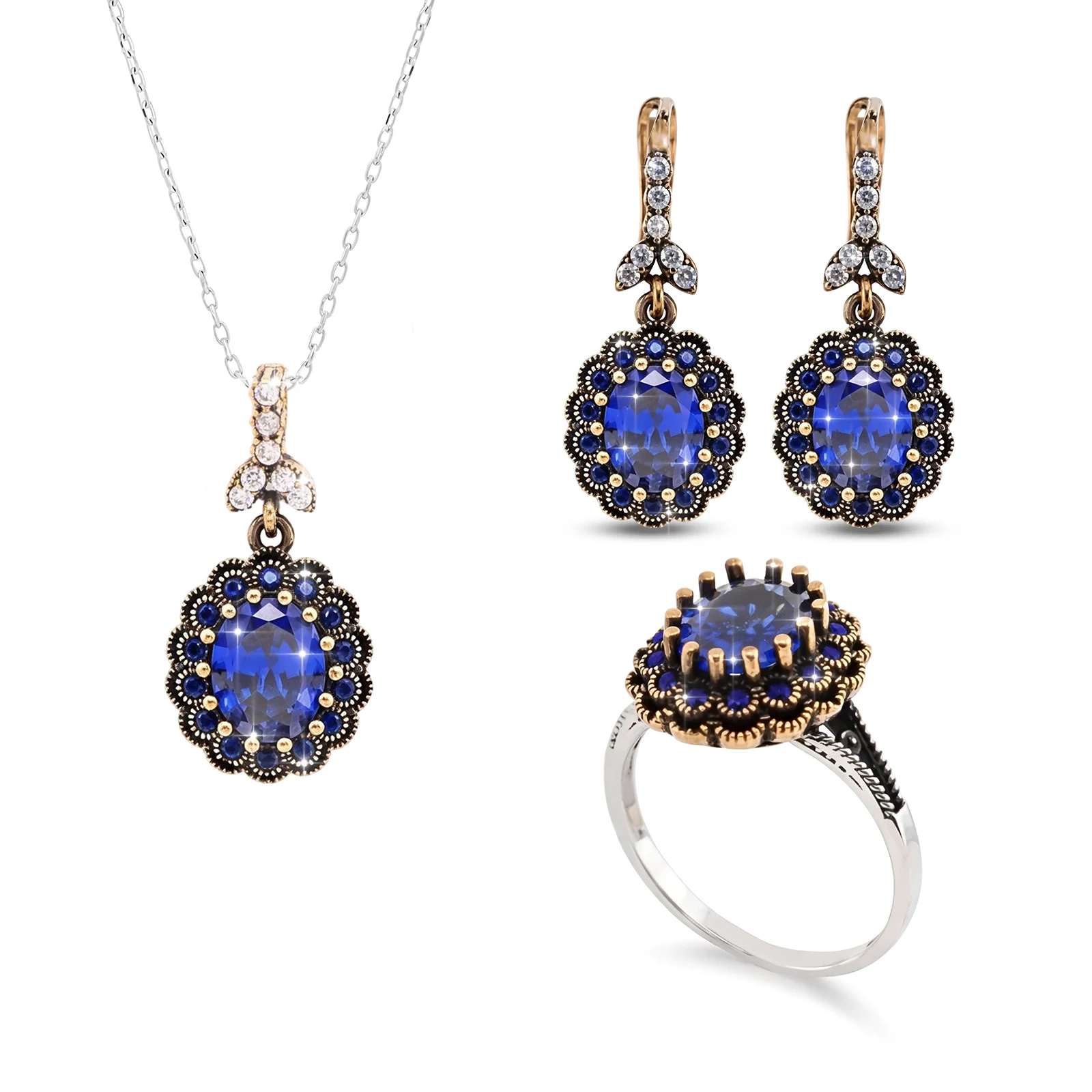 Srebrny komplet z szafirami, zdobiony brązem