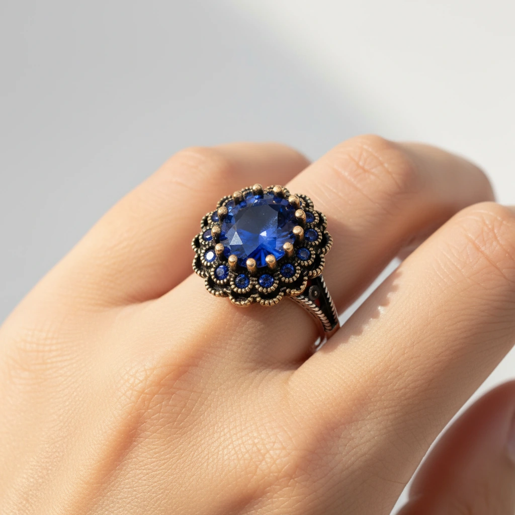Elegancki komplet biżuterii wykonany z srebra próby 925 z elementami brązu, którego motywem przewodnim są intensywnie niebieskie szafiry. W skład zestawu wchodzą: pierścionek, naszyjnik oraz kolczyki - tworzące spójną całość inspirowaną klasycznym jubilerstwem.