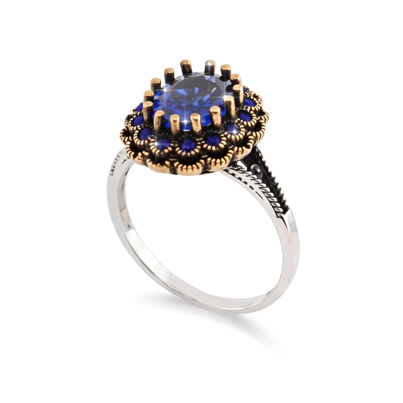Srebrny pierścionek z szafirami zdobiony brązem