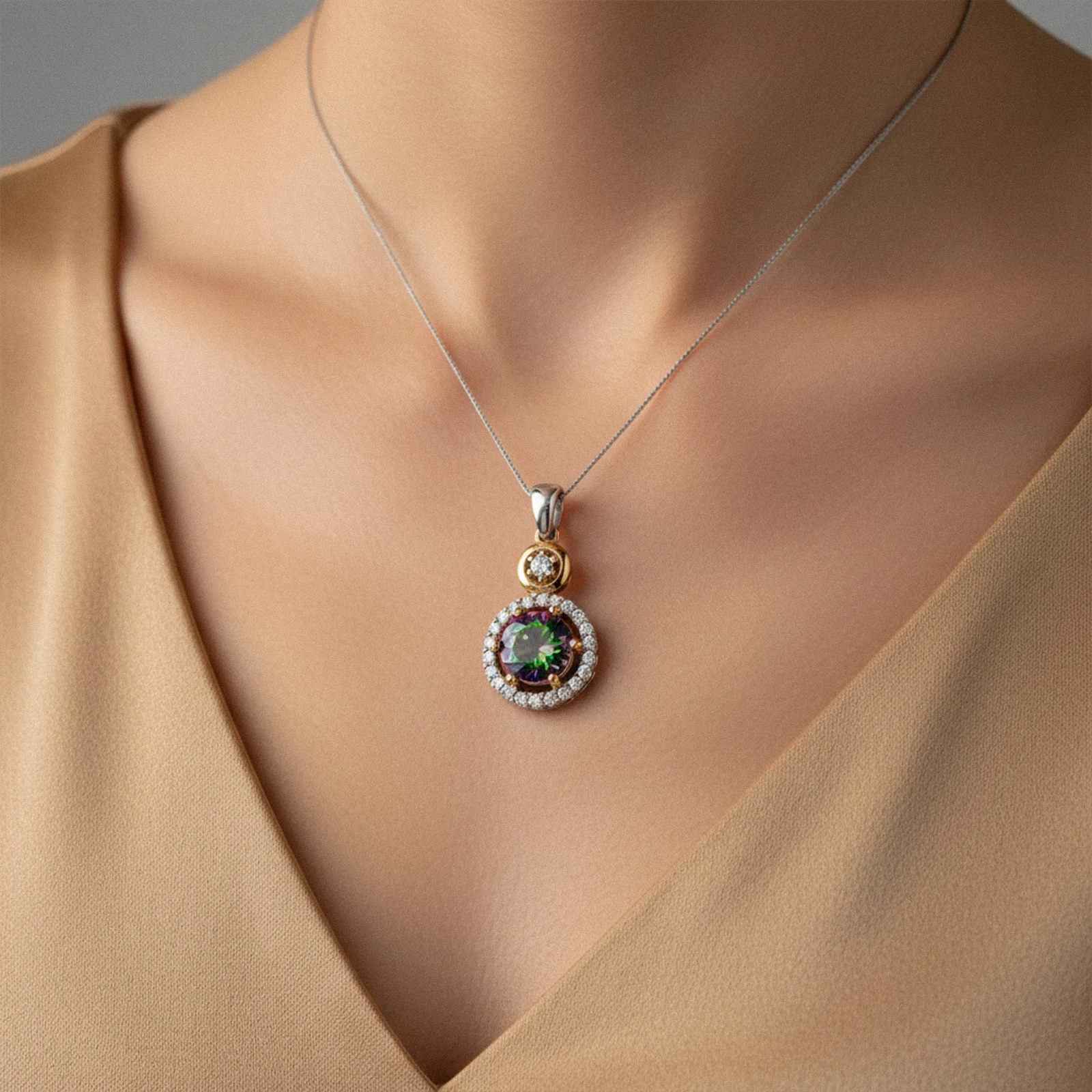 Mistyczny topaz zawieszony na szyi przypomina pamiątkę przywiezioną z odległego miejsca - niepowtarzalną, osobistą, niosącą historię. Połączenie srebra 925 i brązu tworzy kontrast, który podkreśla głębię kamienia i jego zmienne refleksy kolorystyczne.