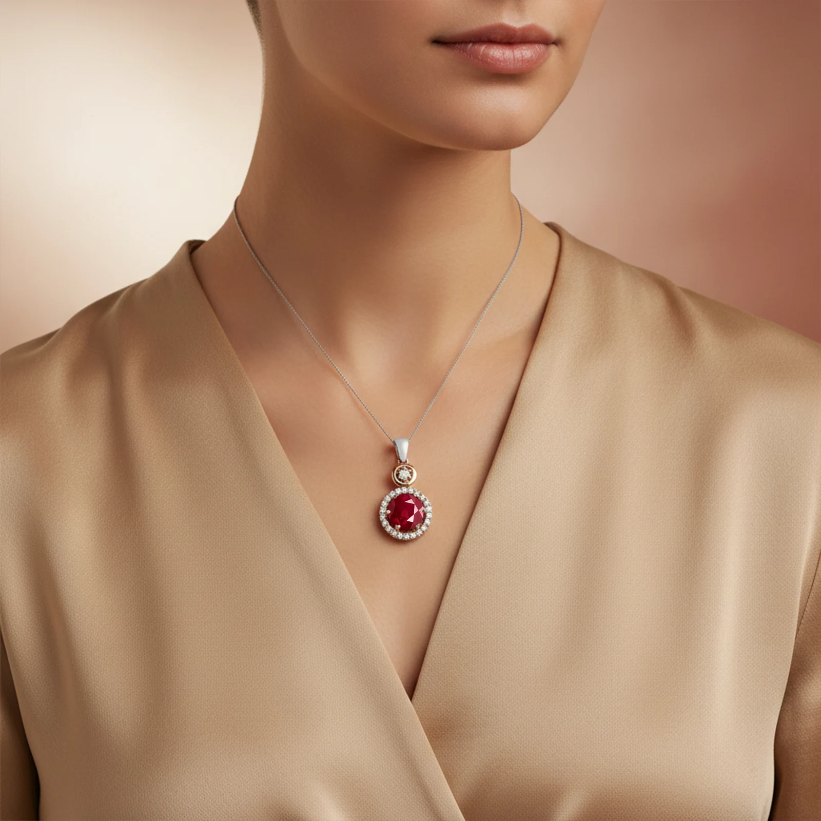Ozdobą naszyjnika jest rubin, który stanowi centralny punkt całej kompozycji. Kamień główny został otoczony cyrkoniami, dodającymi całości lekkości i eleganckiego połysku. Zawieszka wykonana została w oprawie ze srebra 925 i brązu, dzięki czemu biżuteria zyskuje wyraźny kontrast materiałów oraz orientalny charakter. Prosta, wyważona forma sprawia, że naszyjnik dobrze układa się na szyi i pasuje zarówno do codziennych stylizacji, jak i bardziej eleganckich zestawów.