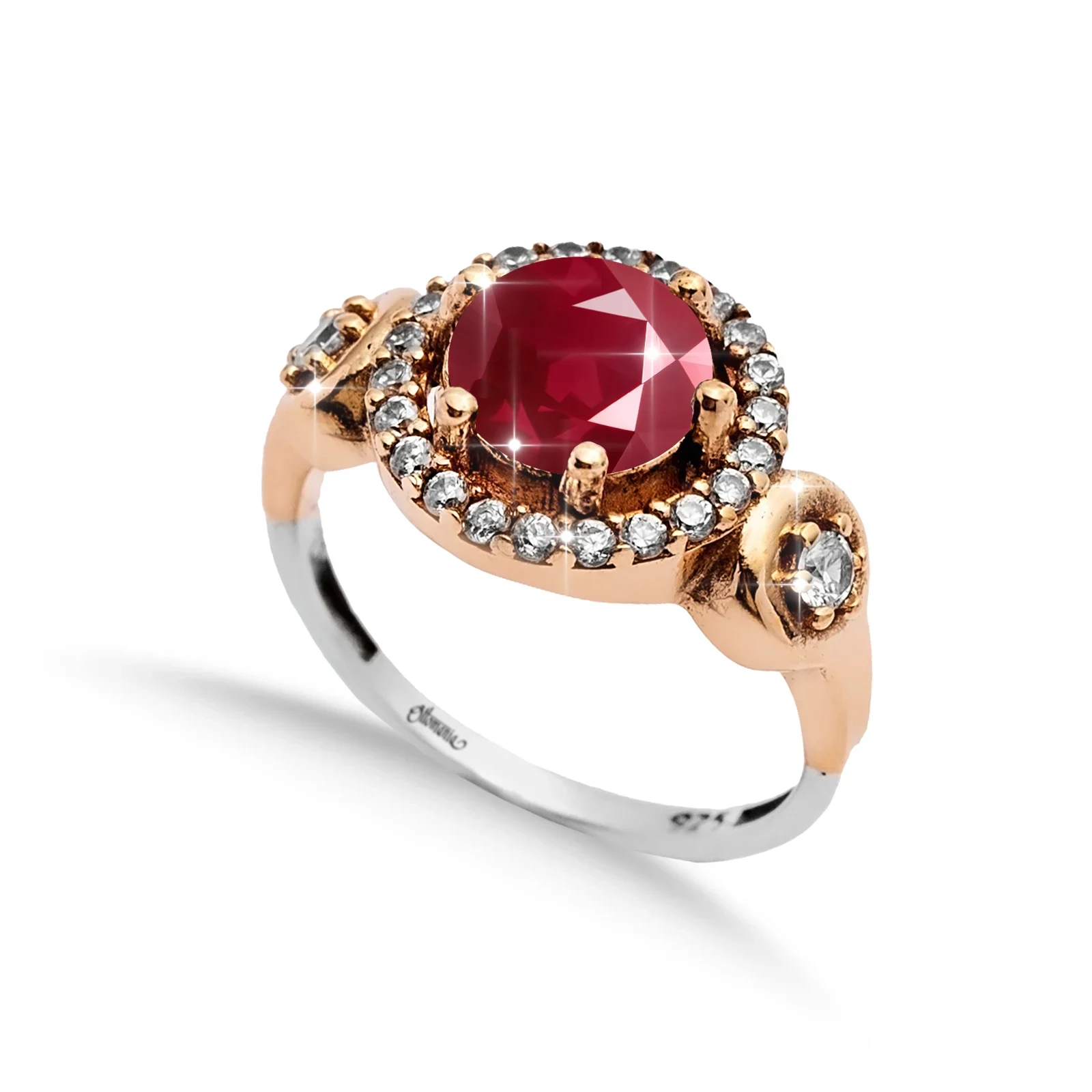 Centralnym punktem pierścionka jest rubin o intensywnej czerwieni, który nadaje całości wyrazisty i szlachetny charakter. Kamień główny został otoczony drobnymi cyrkoniami, tworząc subtelny kontrast i podkreślając jego naturalny blask. Kompozycja została wykonana w oprawie ze srebra 925 i brązu, co nadaje biżuterii ciepły ton oraz wyraźną głębię wizualną. Starannie zaprojektowana forma sprawia, że pierścionek prezentuje się elegancko, a jednocześnie nie jest przesadnie ozdobny.