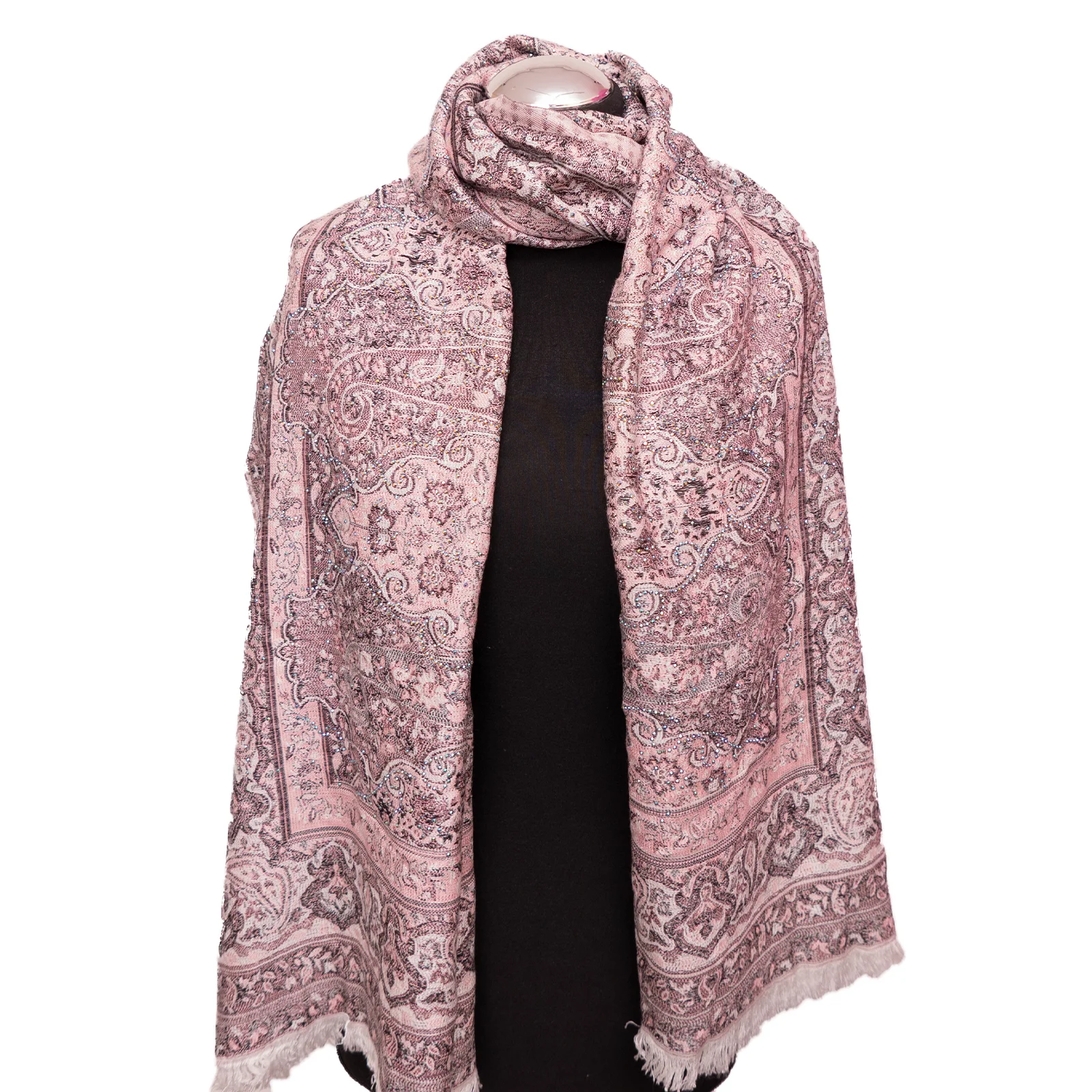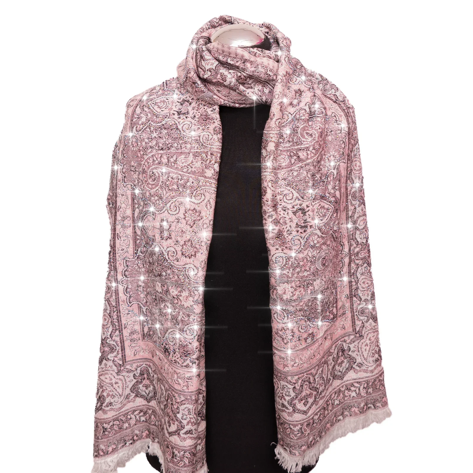 Wykonany z kaszmiru, który zapewnia komfort i miękkość. Cyrkonie zostały trwale aplikowane w ozdobne wzory, dzięki czemu tworzą spójną, dekoracyjną całość. Staranna praca i dbałość o detale sprawiają, że szal łączy luksusowy wygląd z efektowną formą.