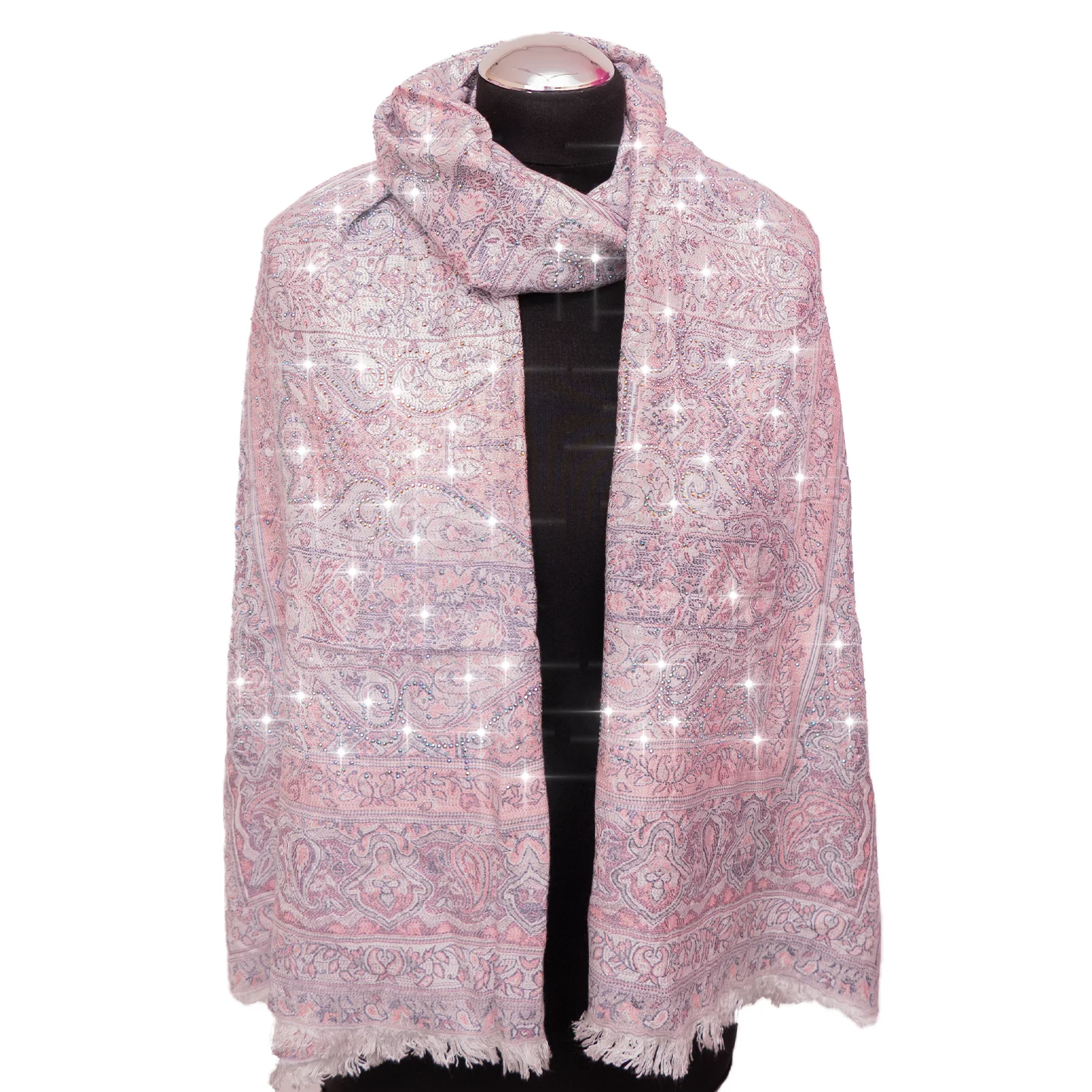 Szal wykonany z kaszmiru, zapewniającego komfort noszenia. Cyrkonie zostały trwale aplikowane w dekoracyjne ornamenty, tworząc spójną i efektowną całość. Staranna praca podkreśla luksusowy charakter modelu.