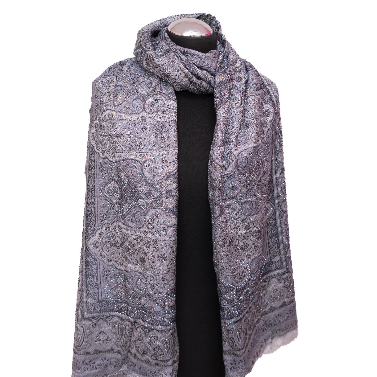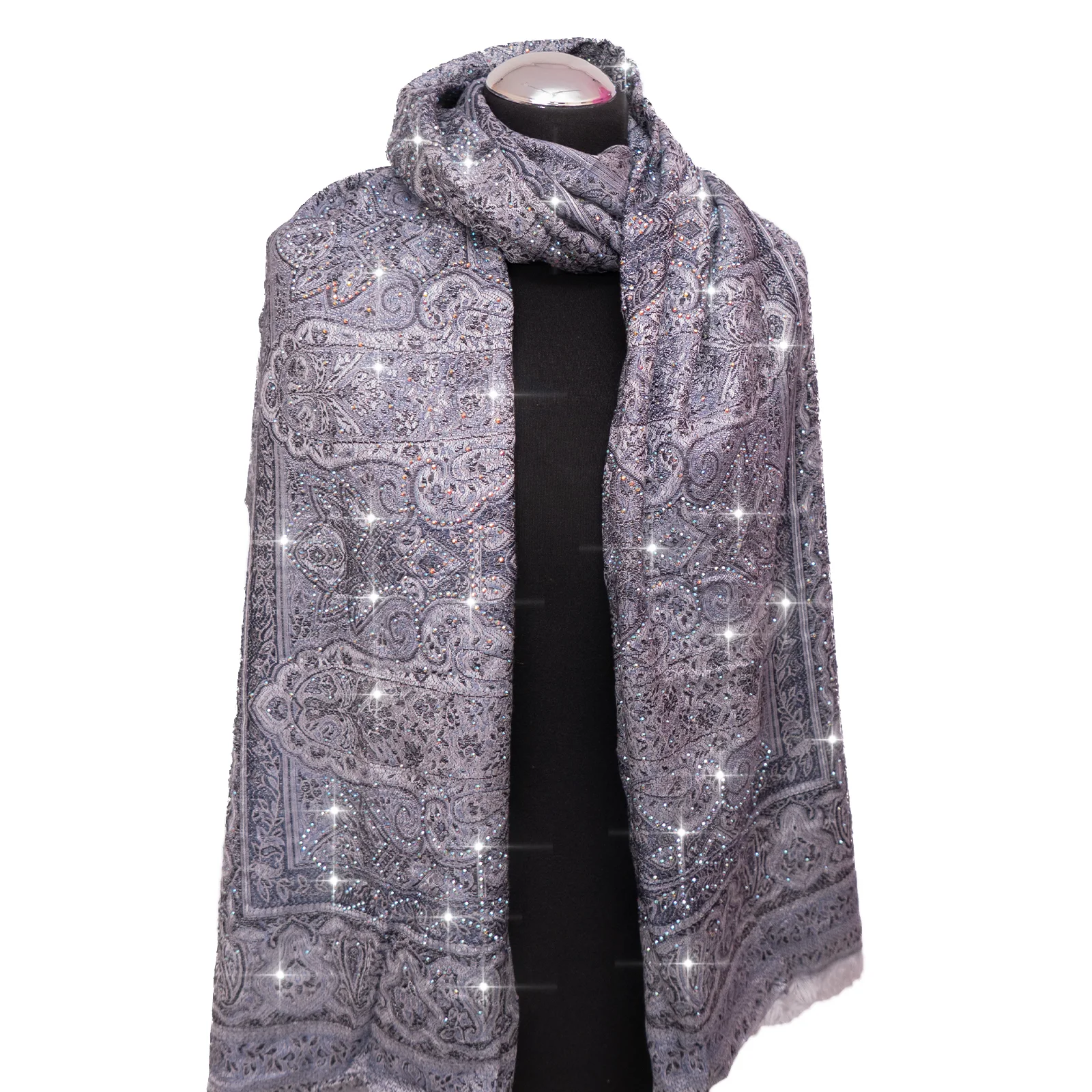 Wykonany z kaszmiru, który zapewnia komfort noszenia i miękkość. Cyrkonie zostały trwale aplikowane w ozdobne wzory, tworząc spójną i efektowną całość. Staranna praca oraz dbałość o detale sprawiają, że szal łączy luksusowy wygląd z mocnym dekoracyjnym charakterem.