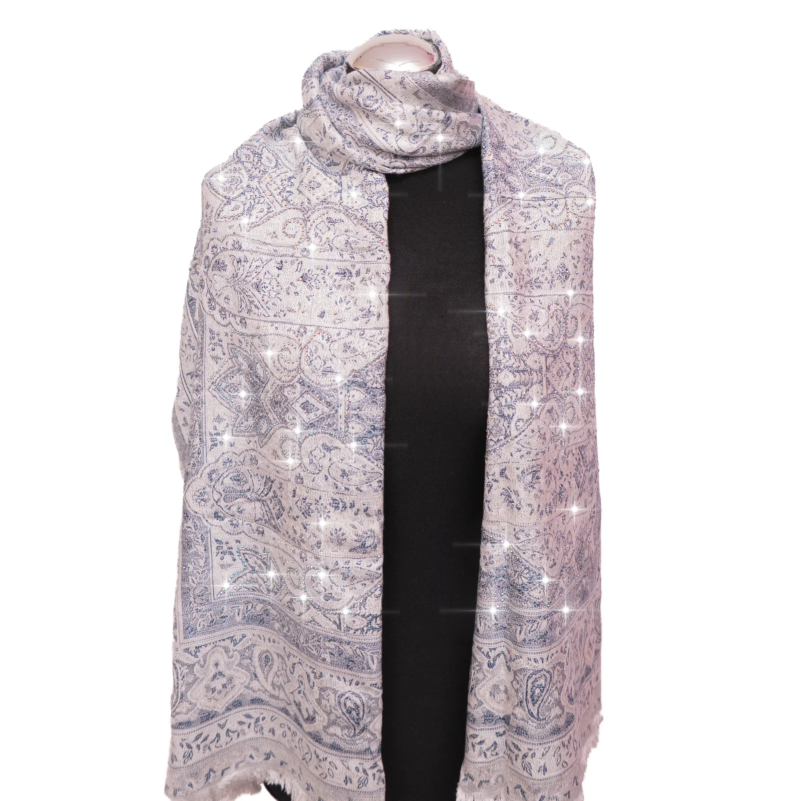 Szal zdobiony jest rozbudowanym ornamentowym wzorem, inspirowanym klasycznymi motywami orientalnymi. Jasne, chłodne tło przełamane zostało srebrzystymi i szaro-niebieskimi akcentami, które podkreślają elegancki charakter tkaniny i wzmacniają efekt światła.
