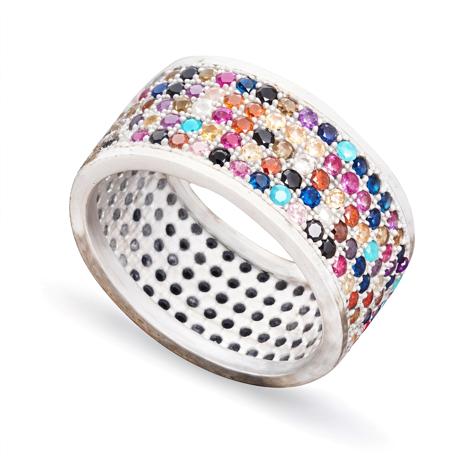 Szeroka kolorowa obrączka - to wyjątkowa srebrna biżuteria prosto ze Stambułu. Dzięki tej orientalnej biżuterii poczujesz się zjawisko. Nikt nie przejdzie obok Ciebie obojętnie. Pierścień wykonany jest ze srebra najwyższej próby - 925. Obrączka ozdobiona jest rzędami małych kolorowych cyrkonii. Kamienie są ręcznie zakuwane, dzięki czemu nie będą wypadać. Decydując się na zakup otrzymają Państwo srebrną obrączkę najwyższej jakości. Biżuteria artystyczna dostępna w Ottomanii wytwarzana jest w samym sercu biżuteryjnego świata - Stambule (Turcja jest jednym z największych rynków biżuteryjnych na świecie). Nic dziwnego więc, że mieszkają tam najlepsi jubilerzy, którzy słyną z niezwykłego kunsztu oraz precyzji w nawet najdrobniejszych elementach. To dzięki ich doświadczeniu i niezwykłym umiejętnościom artystycznym powstała obrączka wysadzana kolorowymi cyrkoniami.