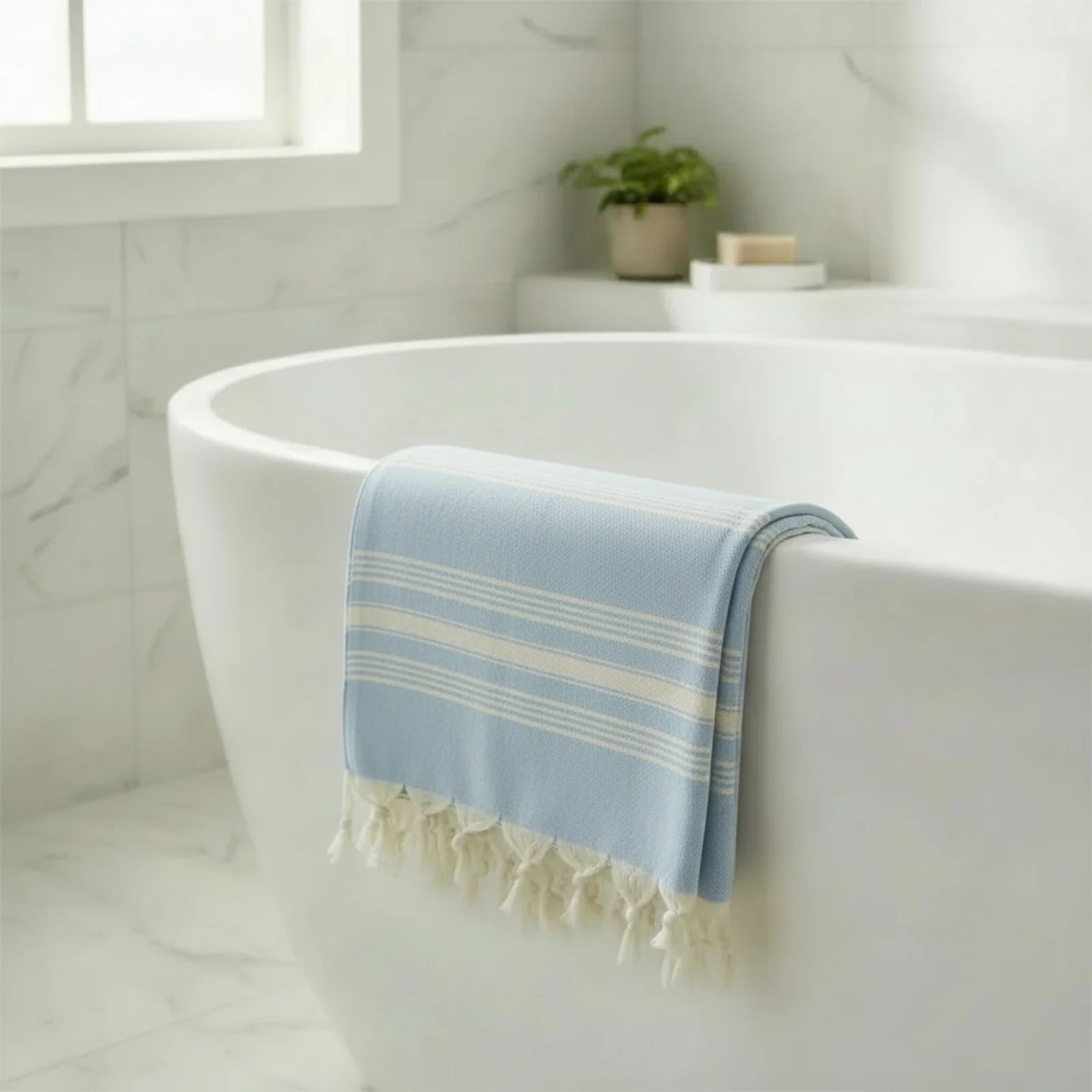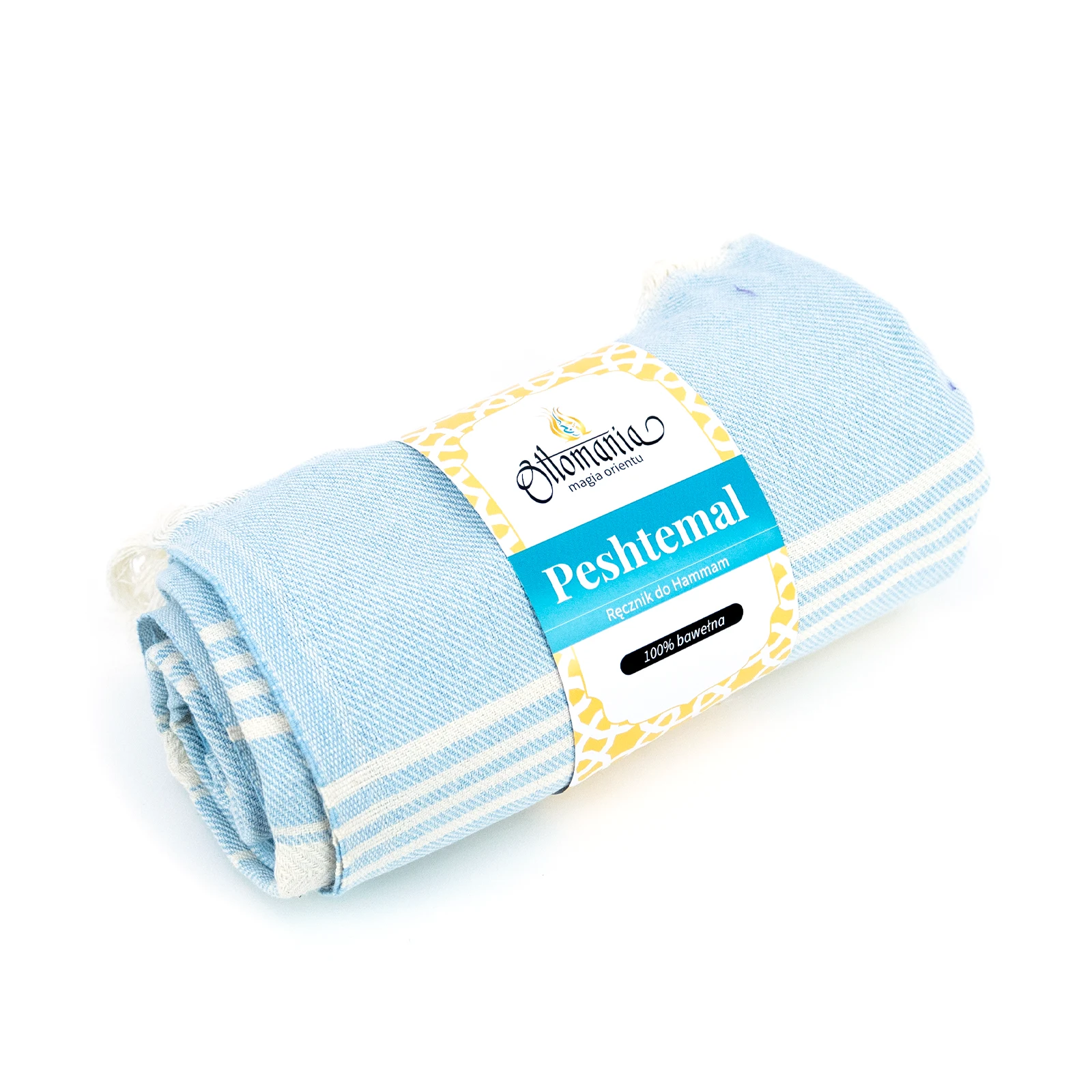 Turecki ręcznik peshtemal to tekstylia, które od pokoleń towarzyszą rytuałom hammamu i codziennemu życiu w drodze. Wykonany z 100% bawełny, jest cienki, dobrze chłonie wodę i szybko schnie. Jasnoniebieski odcień z jasnymi pasami przywołuje świeżość wody i lekkość letniego poranka, a frędzle nadają mu autentyczny, orientalny charakter.