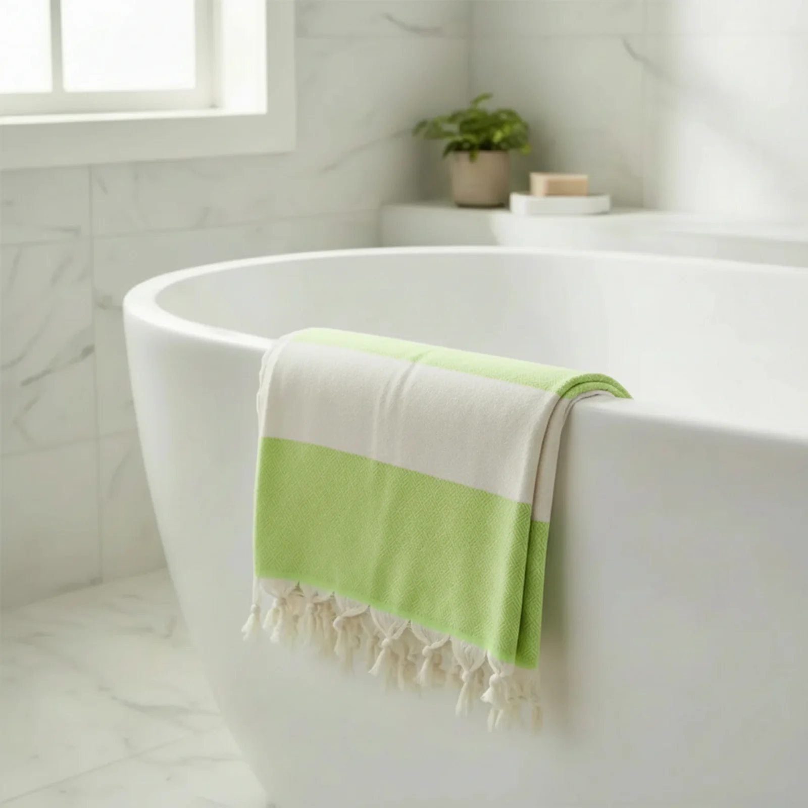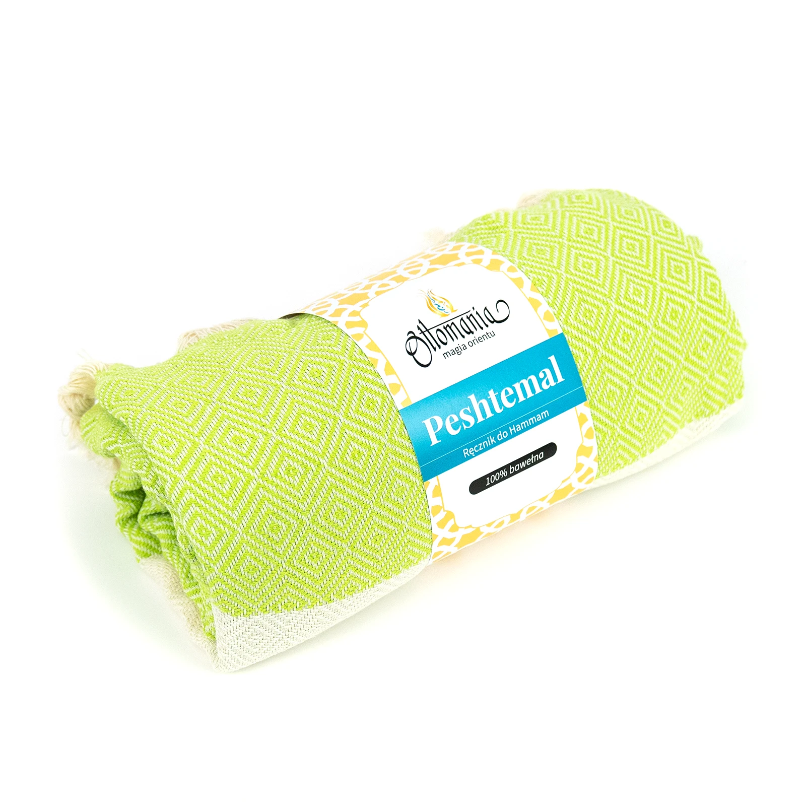 Ten turecki ręcznik peshtemal to połączenie tradycji hammamu z nowoczesną funkcjonalnością. Wykonany z 100% bawełny, zachwyca lekkością, szybkim schnięciem i charakterystycznym splotem. Soczysty zielony kolor z jasnym pasem wnosi do wnętrza świeżość i naturalną energię, a frędzle podkreślają jego orientalny rodowód.