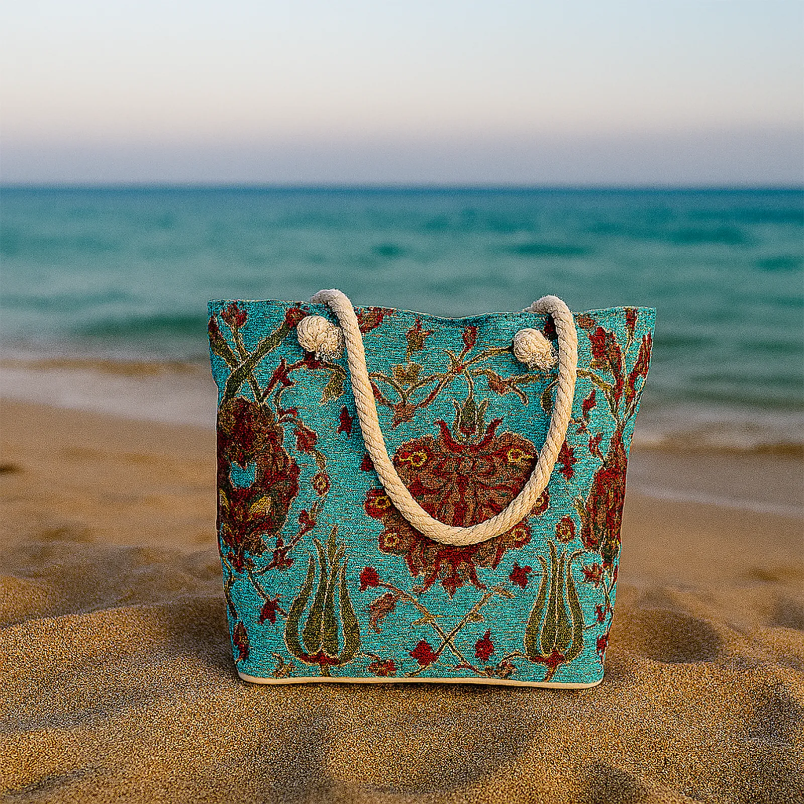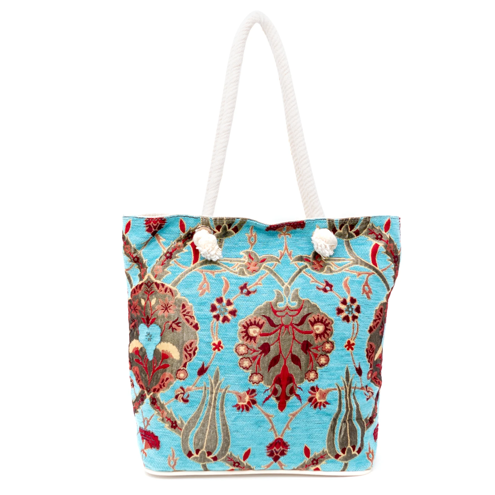 Torba plażowa z tkaniny szenilowej z orientalnym wzorem tulipanów na turkusowym tle