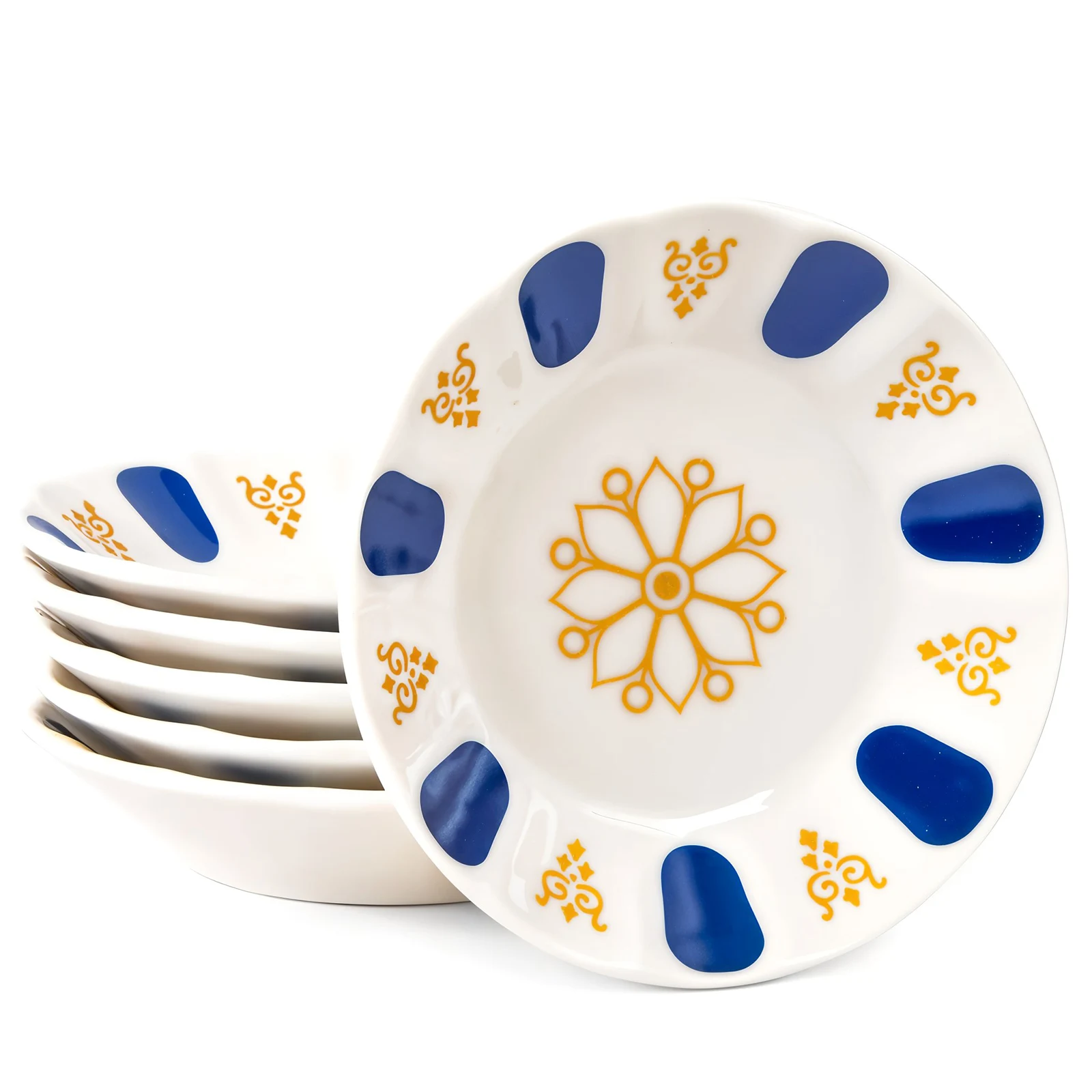 Zestaw 6szt porcelanowych podstawek pod filiżanki 11 cm - biało-niebieskie ze złotym wzorem