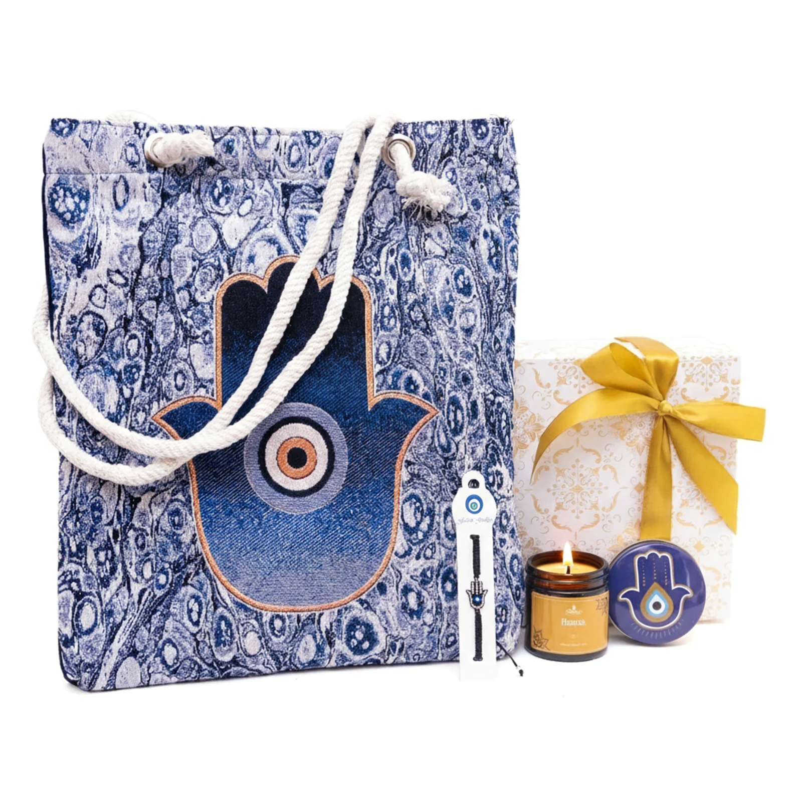 Zestaw prezentowy "Hamsa Pakiet Inspiracji" to praktyczny i elegancki zestaw, idealny na prezent. Znajdziesz go w eleganckim pudełku, zabezpieczonym złotą wstążką. W środku czekają na Ciebie torba gobelinowa, brelok, bransoletka i świeca zapachowa o nazwie "Hamsa". To uniwersalny upominek, który łączy w sobie symbolikę hamsy z funkcjonalnością.